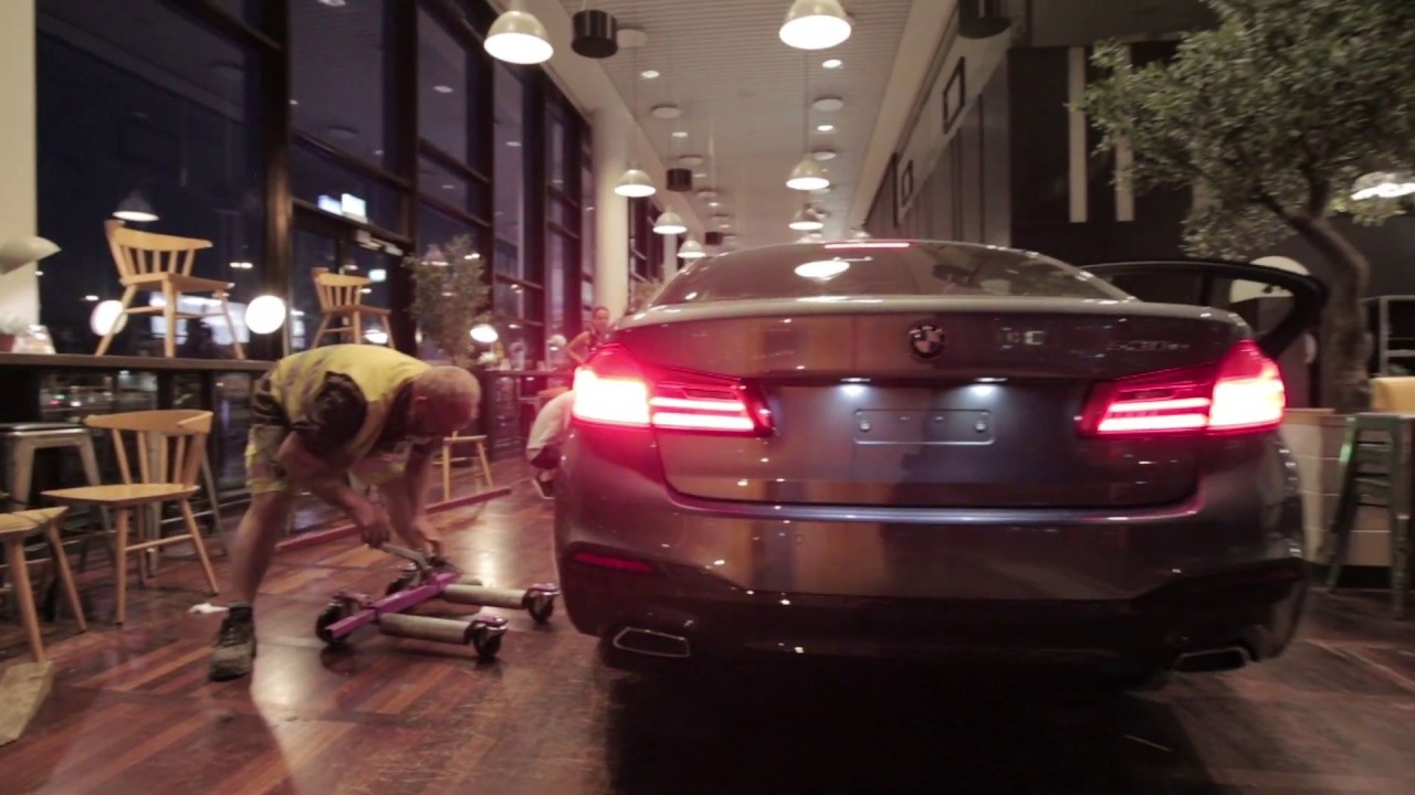 Da der ofte er meget travlt har vi et vindue på nogle timer hvor vi på rulleskøjter kan hente bilen i terminalen.Derfra kan vi skubbe den til restauranten. Vi kører den på rulleskøjter for at skåne gulvet mindst muligt.